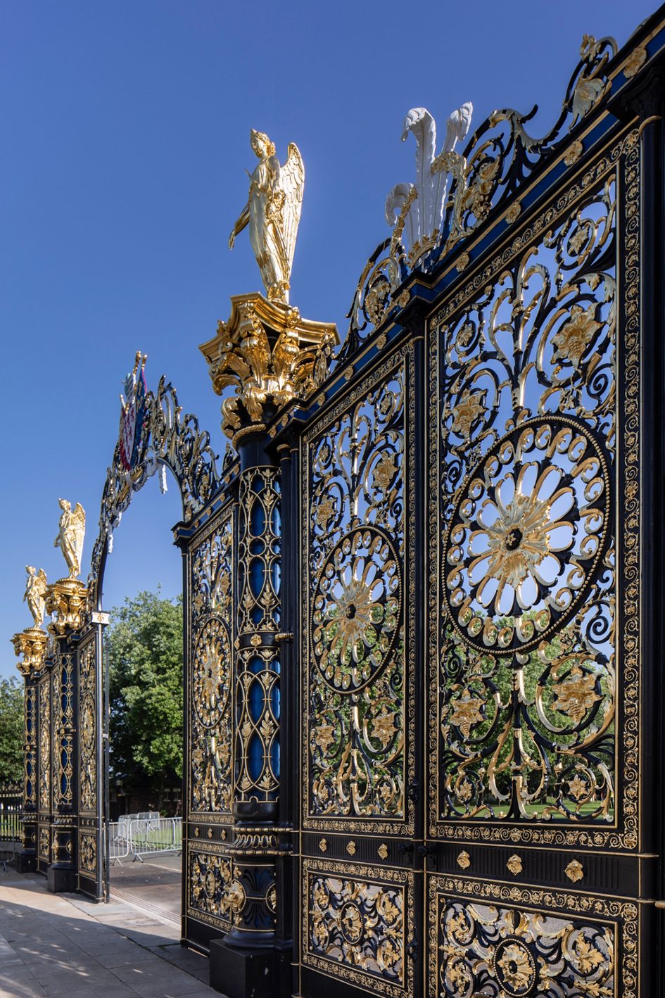 Prior to their removal in October 2018, a 3D laser scan survey produced a sub millimetre high-resolution digital model of the gates. Once fully dismantled, individual components of the gates were also laser scanned at high resolution. Some elements beyond economic repair were re-created using 3D printing to form plastic replicas that were then sent to the foundry to create moulds allowing casting off new components. Some more complex components were replicated directly from the laser scan data by additive manufacturing and were printed in aluminium.