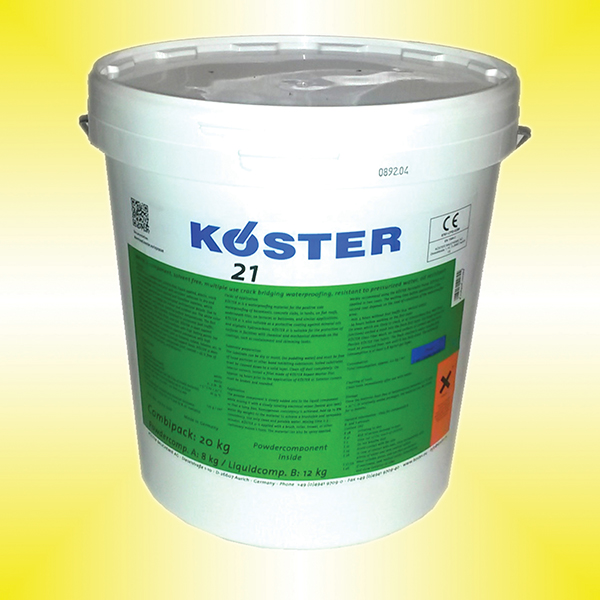 Köster 21 is for the positive side waterproofing of basements, concrete slabs, in tanks, on flat roofs, underneath tiles, on terraces or balconies, and similar applications. It bonds well to a wide variety of substrates, including: masonry, concrete, screed, PVC, metal, and bitumen.