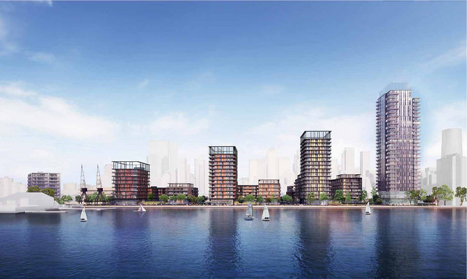 The scheme will see nine blocks built, ranging from four to 30 storeys high — along with a secondary school and offices — on the edge of the Millwall Outer Dock.