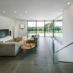 Embracing the traditional geometry of the farmhouse, specific materials and features have been used to tie this renovation together. Skylights have been placed strategically amongst the exterior timber cladding to introduce natural light throughout the build whilst ensuring the owners’ privacy is maintained. Additionally, the hidden subterranean mass below, which comprises a bedroom, plant room and enough garage space for two cars, avoids a visual bulk which could otherwise swamp the proportions of the existing house.