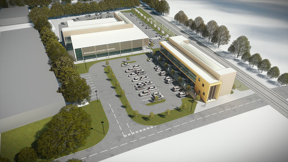 CPMG, the architect responsible for the Rushcliffe Arena development in West Bridgford, has submitted its initial proposals as part of the study. In addition to the leisure centre, which includes both swimming and fitness space, outline proposals illustrate much-needed community space, 10,000ft2 of commercial office and plans to bring an adjacent industrial unit back into use.