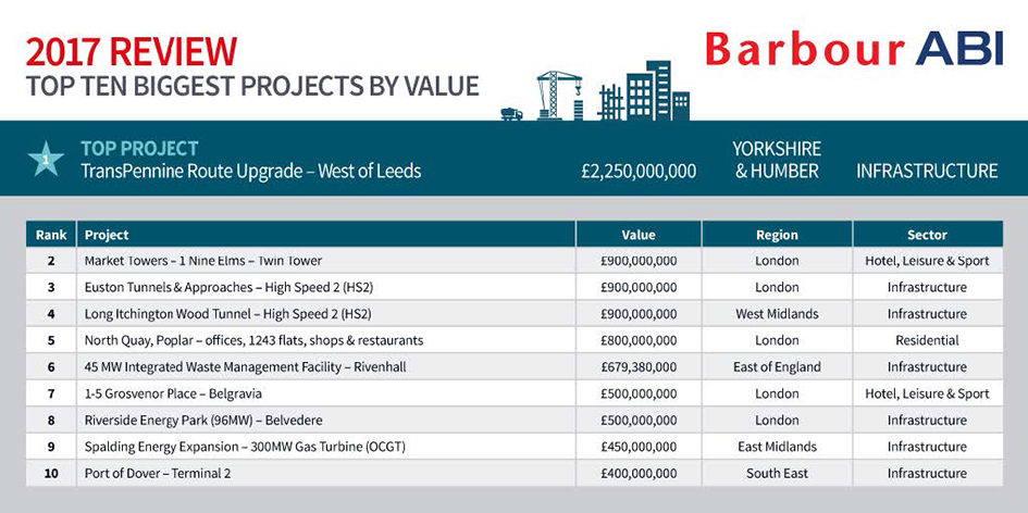 Commenting on the figures, Michael Dall, Lead Economist at Barbour ABI, said: “Projects from the residential housing and infrastructure sectors provided solid foundations for the industry in 2017, as the need for more housing alongside the commissioning of HS2 boosted the total value of construction contracts on the year.”