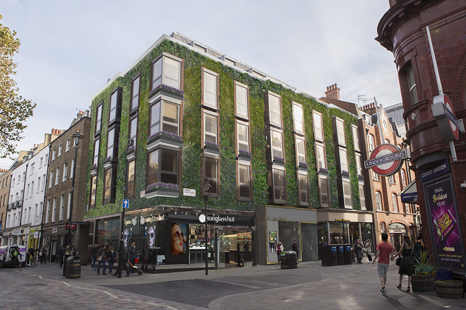 The gateway to Covent Garden will be transformed with a living wall covering over 1,500 sq ft of the building facade to be revealed next month on the corner of Long Acre and James Street – part of a greening initiative recreating the area’s garden heritage.
