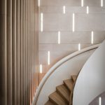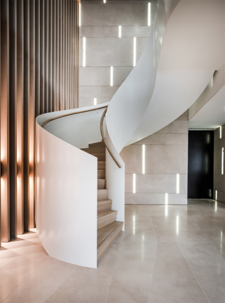 entrance lobby and a smart meeting area that links to the basement floor below via a broad, stone-clad stairway screened in glass and a mezzanine level above via an elegant spiral staircase.