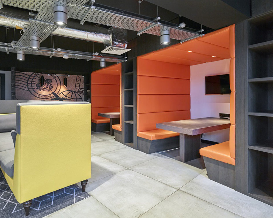 Italian large format concrete effect floor tiles were the starting point for the feel of the space, manifesting itself in industrial style features such as exposed ceilings and iron effect wall coverings. A lighter, more quirky and fun feel was brought in with an eclectic mix of materials, textures and furniture. Bright bursts of colour within the fixed joinery elements and furniture softened the industrial feel. Hundreds of postcards, riveted metal plates, and wire pigeon hole boxes created a variety of feature wallpapers, with wooden pallets forming the public bathroom ceilings and OSB rough boards, ‘branded’ with their delivery information, formed the WC cubicles.
