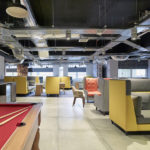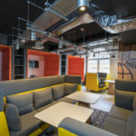 The exposed ceilings and industrial materials opened up the space, maximising the natural light. In conjunction with the client, the team decided to use furniture rather than fixed screens or acoustic baffles to improve the acoustics. 3DReid’s design introduced high backed sofas and chairs (for group or single study) and three booth seats which featured TVs and upholstered banquette seating running up and over the ceiling.