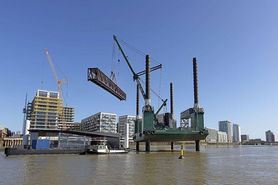 The highly-anticipated Royal Wharf Pier arrived in London yesterday in impressive fashion, as the canting brow, carried on a 65m x 60m boat and the pontoon, brought in by the Mts Viscount tug, were transported along the River Thames to the shores of the landmark Royal Wharf development. Constructed offsite in Holland, the new pier travelled over 300 miles across the North Sea to reach its new home in London, where it will become London’s longest pier and the latest stop on the Thames Clippers service.
