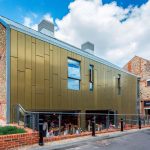 The Proteus HR TECU Brass cladding at Wells Malting creates an outer rainscreen that protects the inner structure from wind and rain. The majority of Proteus rainscreen cladding systems, like those at Wells Maltings, are baffle jointed, allowing a rear ventilated cavity to circulate air, protecting the inner structure from moisture.