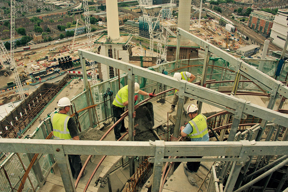 Rather than use a hose to pour the concrete, it was decided to replicate the original construction methods and 680 tonnes of concrete was lifted in a hoist to the top of the chimney, transferred into wheelbarrows and then hand poured into the structures.