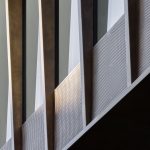 These fins were designed around a rigid bespoke aluminium extrusion that connects to the curtain wall glazing system. The outer TECU Brass element of the fins are profiled in shape and taper across the length to generate an angled effect – the fins increasingly extend outwards as they ascend – whilst the connection of the material to the extrusion and the window frame remains constant.