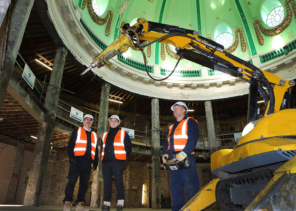 Robertson Project Manager, Andrew Coleman said: “A lot of the work on the Spanish City has been done by hand to date due to the importance we have placed on conserving original fixtures. We’ve been working very closely with a conservation architects from ADP and North Tyneside Council to identify key fixtures like the ornate cornicing and wall mouldings which were hidden behind plasterboard. We’ve even gone as far as to call in expert craftsmen to recreate some of the original plaster work because it’s part of the building’s original character. Now that we’ve identified these details, we are in a position where we can focus on bringing in technology to perform essential works, such as abrasive blasting and remote demolition, which will be used on the main structure which in turn will allow the project team to transform the look of the building bring it back to its original appearance. Due to the nature and location of the works, where possible we will use Brokks (remote controlled demolition robots) which will allow the works to be carried out in a safe, controlled manner. The fact that we don’t have a man inside them means that the operator can stand at a safe distance and reach areas within the structure that would prove very challenging otherwise.”