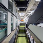 Differentiating the old and new, white plastered partitions have been inserted into the concrete shell to divide teaching rooms from the atria. Where possible, glass screens are also used to keep visual links and lightwells open. Each area of the school benefits from colourful wayfinding devices, seen mainly in the glass manifestations and the vibrant flooring choices for the main circulation stairs, acting as a wayfinding strategy to navigate the different areas of the school.