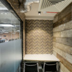 Jim Scott of Scotwood Interiors explained what was involved in the fit-out: “The design involved stripping out existing flooring and suspended ceilings to leave exposed services with new LED lighting and adaptation of existing heating system. The creation of meeting rooms was done with a mixture of glazed and solid partitions with laminate doors, and bespoke features such as reclaimed scaffold board feature walls, we also created new kitchen and breakout area again using bespoke industrial style finishes to maintain the industrial feel.”