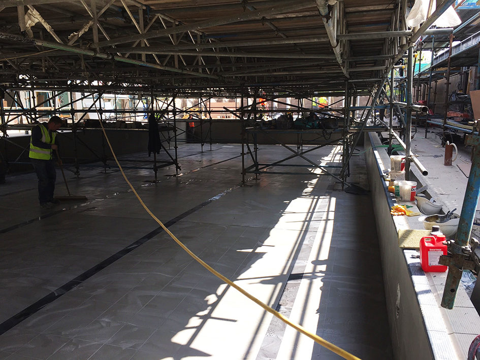 Work on the waterproofing element of the refurbishment began in February 2017. The pool’s uneven substrate was among the main challenges encountered by contractors. It meant extensive re-profiling was required to ensure a flat surface to enable tiling and create a visual effect as part of an overall aesthetic. The Sika®-1 Pre-Bagged Waterproofing System was hand-applied to the entire surface. Along with the screed, it was applied to pre-set rails in order to provide excellent lineage.