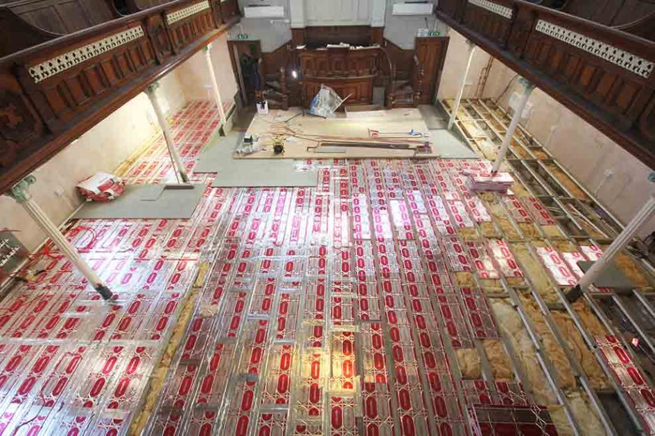 Shane Weller recounted: “I went online to compare the different underfloor heating solutions available, to decide which one best suited the needs of the Baptist Church, where it could be so cold that some members of the congregation said they were put off going to services in the depth of winter. As well as the lack of insulation to the structure, it is a very tall space with additional seating around a gallery. CircoBoard seemed to offer the best overall package in terms of performance, as well as ease of installation between the new timber joists.”