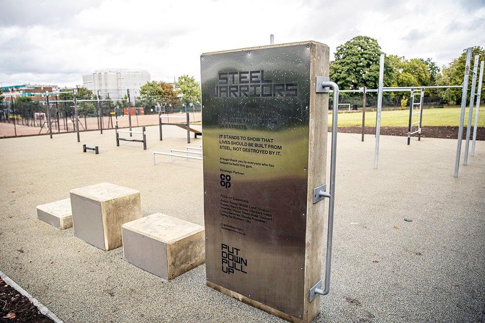 A majority of the equipment featured in the park in Brixton, South London, is made from recycled knives. It is the latest project from Steel Warriors – a charity that aims to reduce the number of young people carrying knives in the UK through melting down knives that haven’t been used in conflict and creating spaces for exercise.