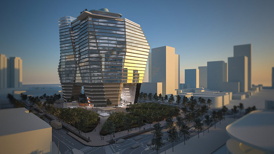 The office towers (28, and 63 storeys respectively) are sculpted to complement the varied site constraints, maximise solar shading, while facilitating access to natural daylight for every desk within the generous office floors.