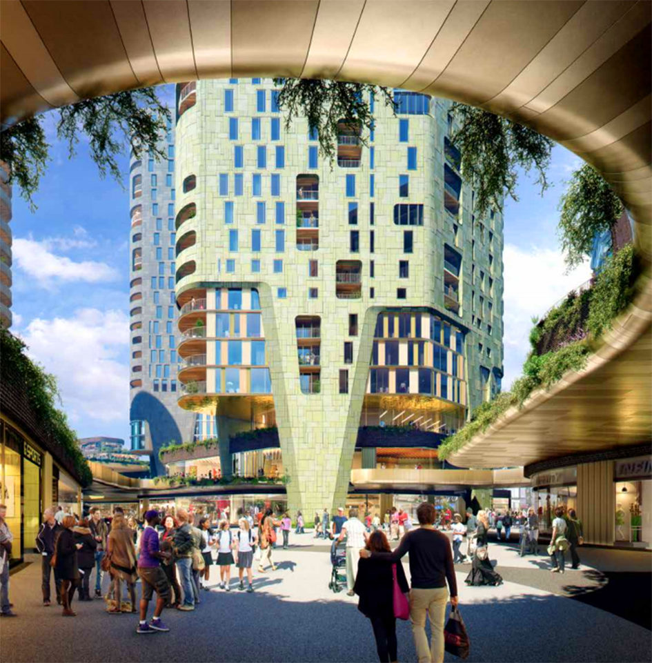 Designed by architect Studio Egret West, the five-acre plot in the town centre will see five central buildings rising from 13 to 36 floors from two large footprint podium buildings containing the retail and leisure space.