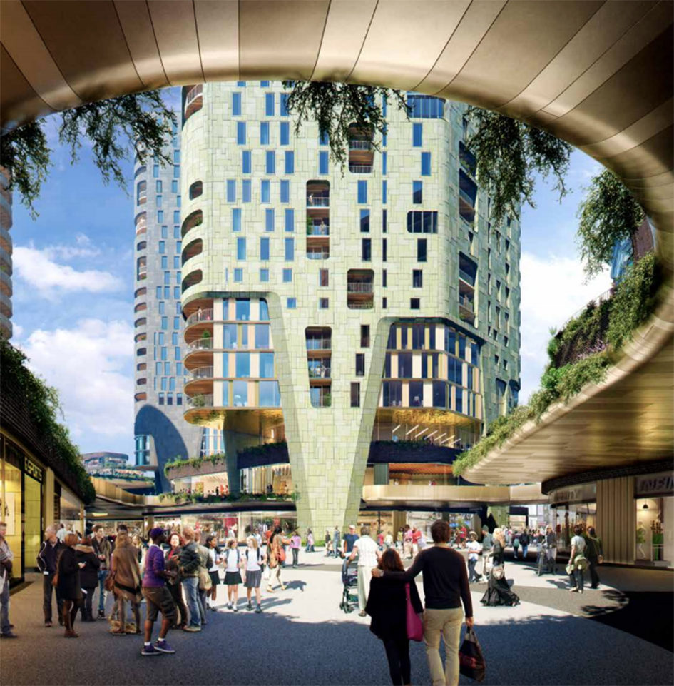 Designed by architects Studio Egret West, the five-acre plot in the town centre will see five central buildings rising from 13 to 36 floors from two large footprint podium buildings containing the retail and leisure space.