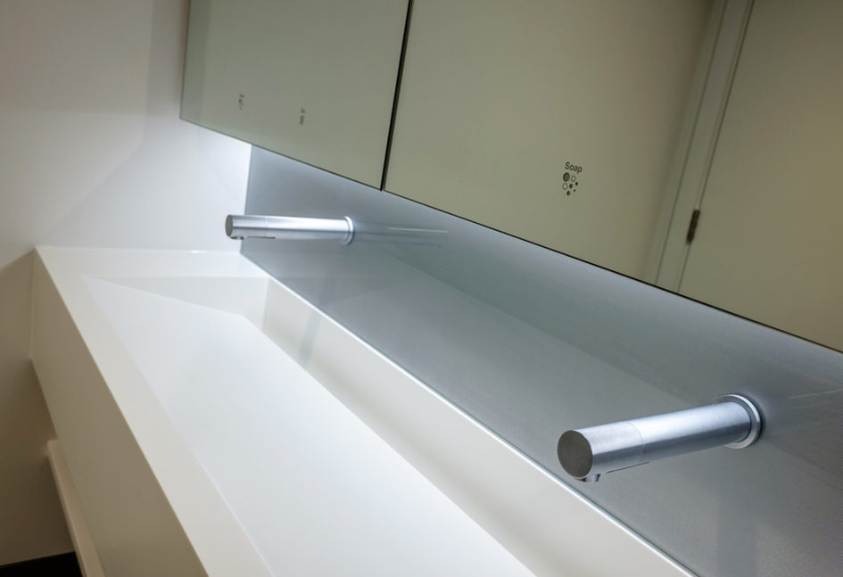 The bespoke Corian trough style vanity units have been designed to deliver a contemporary, high specification feel to complement the rest of the building. The stylish vanity units also feature Swiss Lamex metallic effect glass splashback panels behind the sinks for a completely bespoke finish, while Washroom’s Tego hinged mirror system above completes the design. Washroom is also set to install all the ancillaries in the washrooms as part of the project.