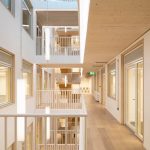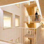 Inside, a full height atrium opens up the lobby space at ground floor and provides natural light and sky views from each floor’s circulation space, while acting as a place for impromptu conversation. The central exposed CLT cantilevered staircase is the pivotal connection between the existing concrete building and the timber extension. This innovative design was made possible using resin bonded steel rods placed within the treads, with the half landings suspended from steel tension system. Open plan kitchens encourage active collaboration, use of recycled carpet tiles, low energy lighting and water saving technologies contribute to reduction in VOCs, electricity and water consumption.