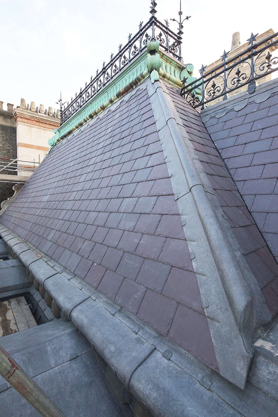 Due to tight access on the roof, they were also able to widen the lead gutters and set back the lower courses of slates to avoid getting them broken. All the new Penrhyn slates were holed and traditionally fixed with 38mm copper nails as opposed to clipped or other methods. The standard-size slates were able to cope with the wide variation of roof pitches and new rooflights encountered by varying the lap and gauge slightly.