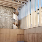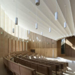 The 309-seat cherry-lined Susie Sainsbury Theatre now forms the heart of the Academy. Inspired by the curved shapes of string instruments, it has been acoustically refined to deliver excellent sound qualities. Each acoustic treatment has its own graded detailing to blend the sound in all directions. Above the Theatre, the 100-seat Angela Burgess Recital Hall provides 230m of additional space for student rehearsal, public performance and recording. The Theatre is designed intimate and epic whereas the Recital Hall is tranquil, calming and visually cool. The Recital Hall is entirely lined in pale, lime-washed European oak. Woven into the design are structural elements reminiscent of string instruments. Through an aperture of finely tuned ‘strings’, an oak-lined oculus floods the space with light and provides a central focus.