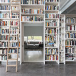 frame clad in varied widths of shot-blasted timber and galvanised steel. The rhythmic façade reads like the bark of silver birch trees found on the site. The landscape is drawn into the building’s two double-height volumes through large axial openings. A long gallery entices visitors in. A tall south-facing library evokes a forest clearing in the heart of the house. The spacious library is wrapped by a