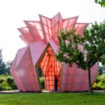 The birch ply and fabric structure is a contemporary version of the follies or ‘eyecatchers’ featured in 18th and 19th century landscaping. The sculptural form is based on a rectangle of paper that has been folded in a way that gives it structural stability and creates a sense of shelter. The most important aspect of the work was to create a sense that the final form had been folded into place, and that the edges were sharp. The artists opted to use engineered ply, cut using a five axis CNC, to create the individual components later to be assembled in the workshop. The structure is made of 90 rhomboid timber cassettes with fabric pulled over and invisibly fixed to each.