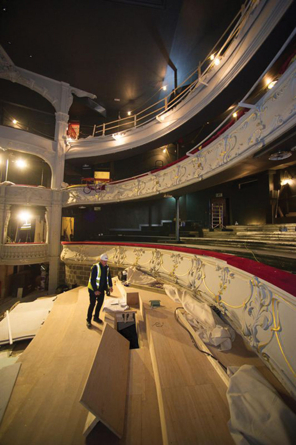 Work to the main upper theatre gallery has included a complete remodelling and reprofiling for better viewing angles, with significant structural and joinery work. The dress circle has also been reprofiled to provide disabled access, and carpets have been replaced in the upper dress circle. Gallery fronts to all three levels at the theatre have required remedial strengthening work and structural improvements, along with lighting bars and brackets. The back of the top two galleries now has new steel supports and specialist plastering to ensure it remains in keeping with the existing theatre, which has been time-consuming work for the William Birch team. As Rob Pell explains, “There was no Christmas break for some of the specialist craftsmen within the team. We’ve reprofiled the stalls, which will now meet the line of the first dress circle, and created a new tiered floor as opposed to the previous sloping floor. It’s really beginning to take shape now.”